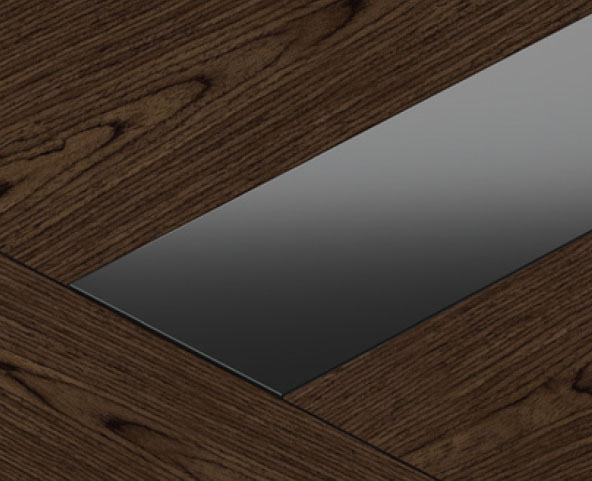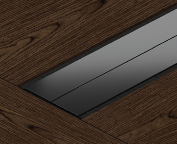 У модульного стола для переговоров с коробом в центре расположена flap-вставка - глянцевые откидные панели с щетками для вывода проводов. Панели